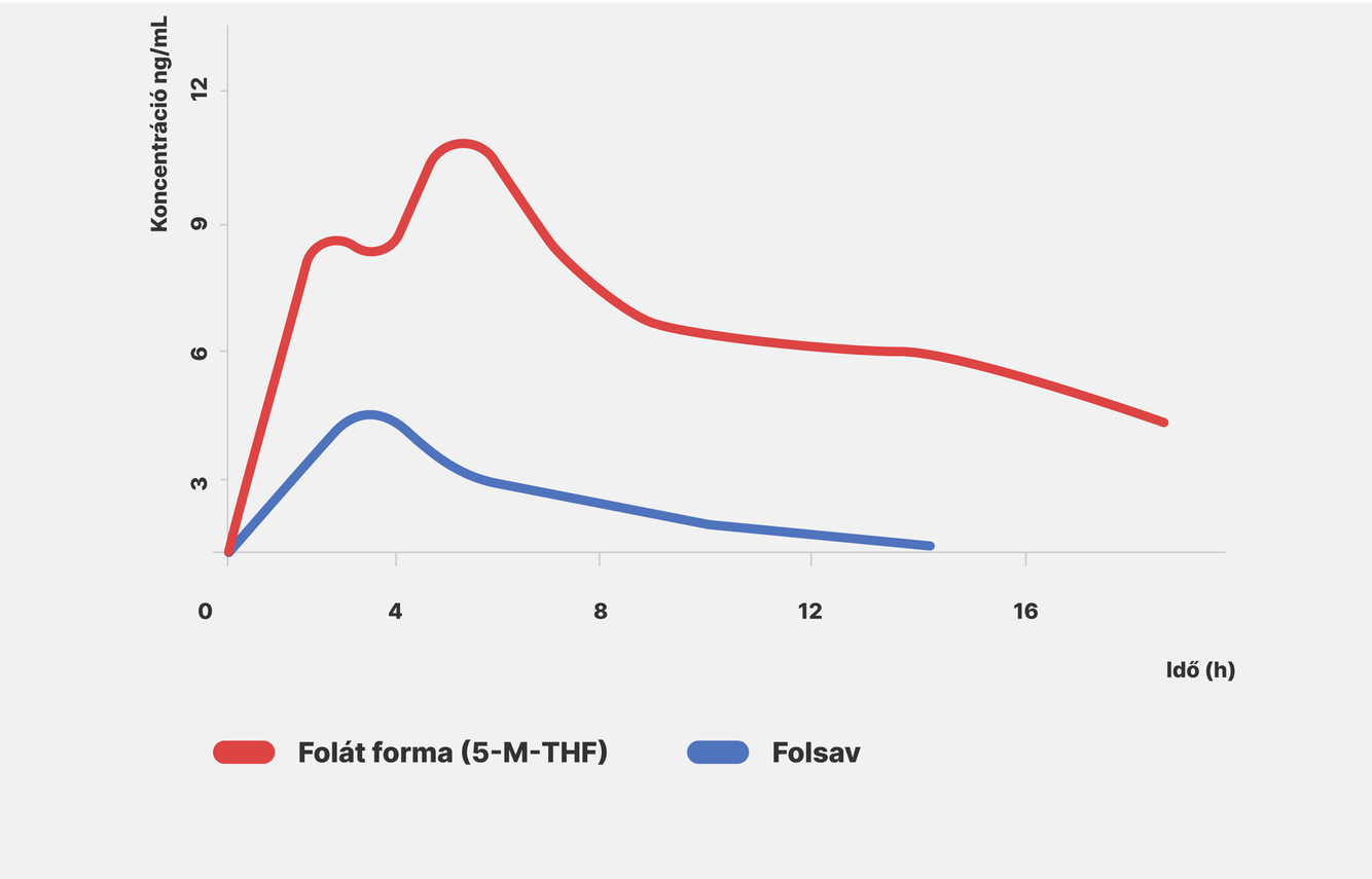 A folsav (FA) és az aktív folát (5‑MTHF) felszívódásának összehasonlítása a vérben [1]